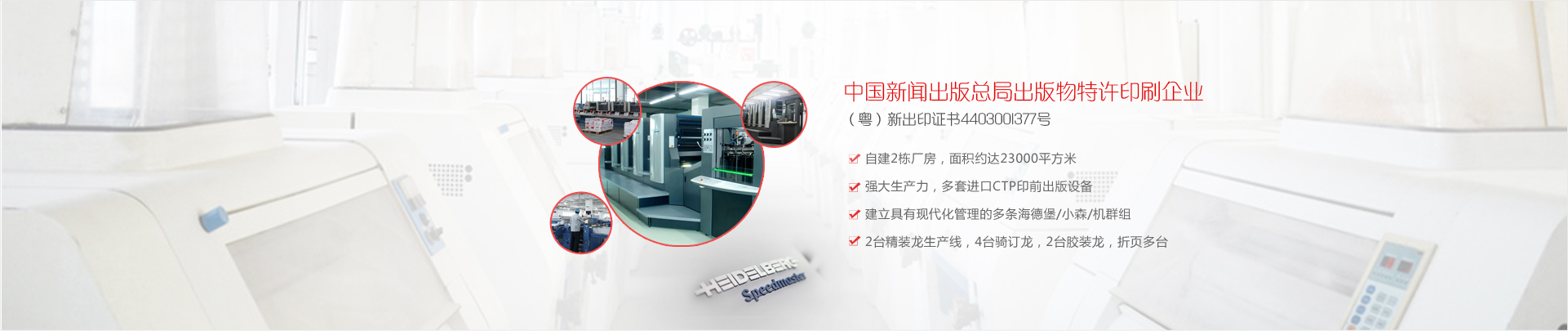 公司實力雄厚,設備先進。 聚集了許多高等院校的尖端高級印刷專業人才,擁有國際頂尖的、全球最大的成套印刷設備— - 德國海德堡-對開四色、五色、雙色、單色、四開四色機等的主體印刷設備, 擁有高水準后道加工系統—— 全電腦控制的斯塔爾折頁機、 STAHL 自動折頁機、 全自動鎖線機、 全自動騎馬訂聯動機、馬天尼膠裝龍、 程控切紙機、環保型過膠機、啤機等 精良裝備,整套印前印后設備。